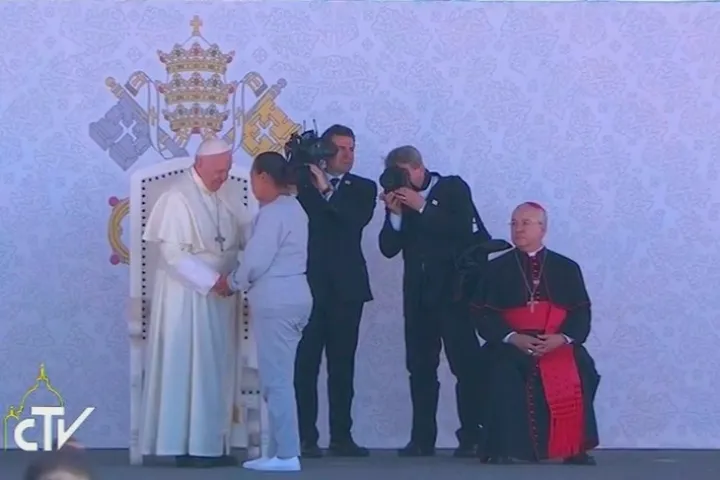 Depois, Francisco saudou 20 mulheres e 30 homens distinguidos por sua boa conduta. Eles lhe deram de presente uma férula lavrada a mão, um bastão de 1,95 metros e uma vasilha artesanal típica de uma região.