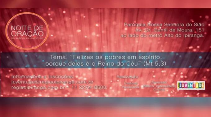 Dando continuidade ao programa de Evangelização que o Papa Francisco propôs aos jovens na JMJ Rio 2013, a Pastoral Vocacional, a Dimensão Bíblico-catequética e o Setor Juventude da Arquidiocese de São Paulo (Região Episcopal Ipiranga), organizam no próximo sábado, 12, das 19h às 22h a “Noite de Oração” pelo Dia Mundial da Juventude. O ato será na Paróquia Nossa Senhora do Sião com as presenças do Cardeal Dom Odilo Pedro Scherer, Arcebispo Metropolitano, e do Padre Anísio Hilário, Vigário Episcopal para a Região Ipiranga.