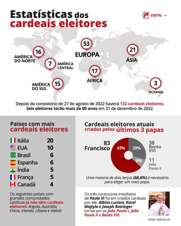 A Itália terá o maior número de cardeais, com 47, e o maior número de cardeais eleitores, com 20.