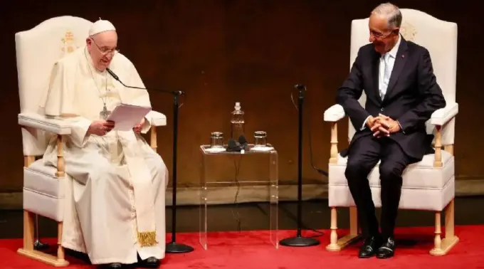 “Saúdo-vos cordialmente a todos vocês e agradeço ao senhor presidente o acolhimento e as amáveis palavras que me dirigiu. Estou feliz por estar em Lisboa, cidade do encontro que abraça vários povos e culturas e que, nestes dias, se mostra ainda mais universal; torna-se, de certo modo, a capital do mundo”, disse o papa Francisco.