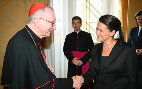 O cardeal Pietro Parolin recebe a presidente da Hungria, Katalin Novák, 25 de agosto de 2023. / Vatican Media
