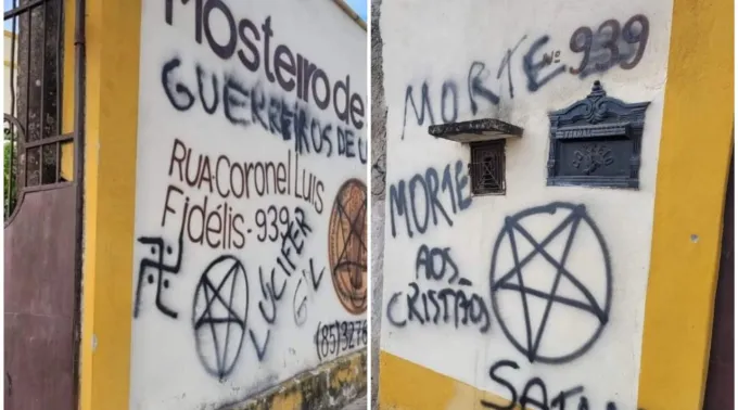 O mosteiro de São Bento, em Fortaleza (CE), foi pichado na madrugada de hoje (20) com frases ofensivas como “Morte aos cristãos”, “Satan vive” e “Guerreiros de Lúcifer”, suásticas e pentagramas. Ossos de gatos também foram deixados na entrada do local. Um boletim de ocorrência foi registrado.