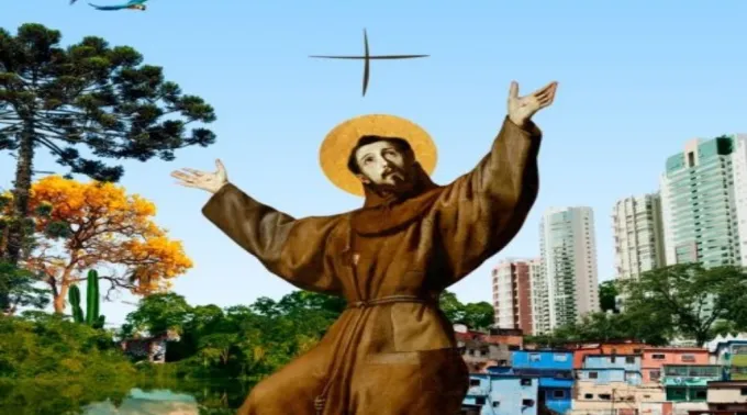 São Francisco de Assis está em destaque no cartaz e segundo a CNBB “representa o homem novo que viveu uma experiência com o amor de Deus, em Jesus crucificado, e reconciliou–se com Deus, com os irmãos e irmãs e com toda a criação”. “Esta reconciliação universal ganha sua maior expressão no Cântico das Criaturas, composto por São Francisco há precisos 800 anos. O recorte é da obra do período barroco “Êxtase de São Francisco de Assis”, de Jusepe De Ribera”, relata a Conferência