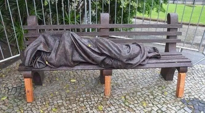 Na escultura, em tamanho natural, Jesus é representado como um sem-teto deitado em um banco, envolto em um fino cobertor do qual despontam somente os pés chagados.