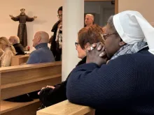 Fiéis rezam o rosário pela saúde do papa em frente ao Hospital Gemelli
