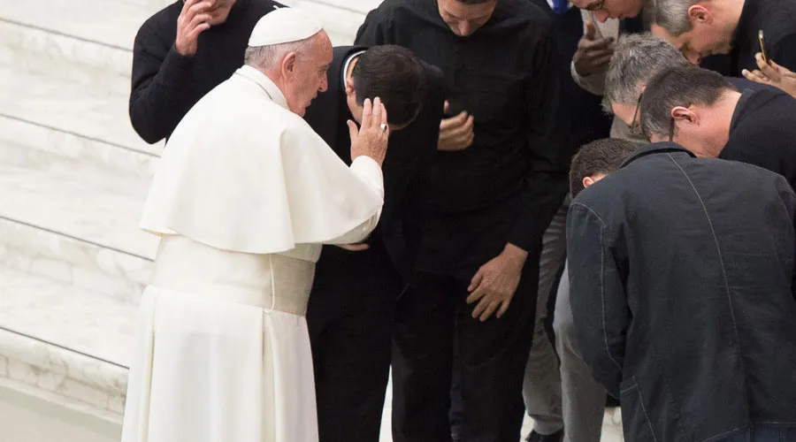 Papa Francisco abençoa um grupo de fiéis na Sala Paulo VI, no Vaticano.